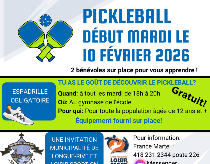 IL Y AURA ACTIVITÉ DE PICKLEBALL POUR TOUS LES CITOYENS DE 12 ANS ET PLUS